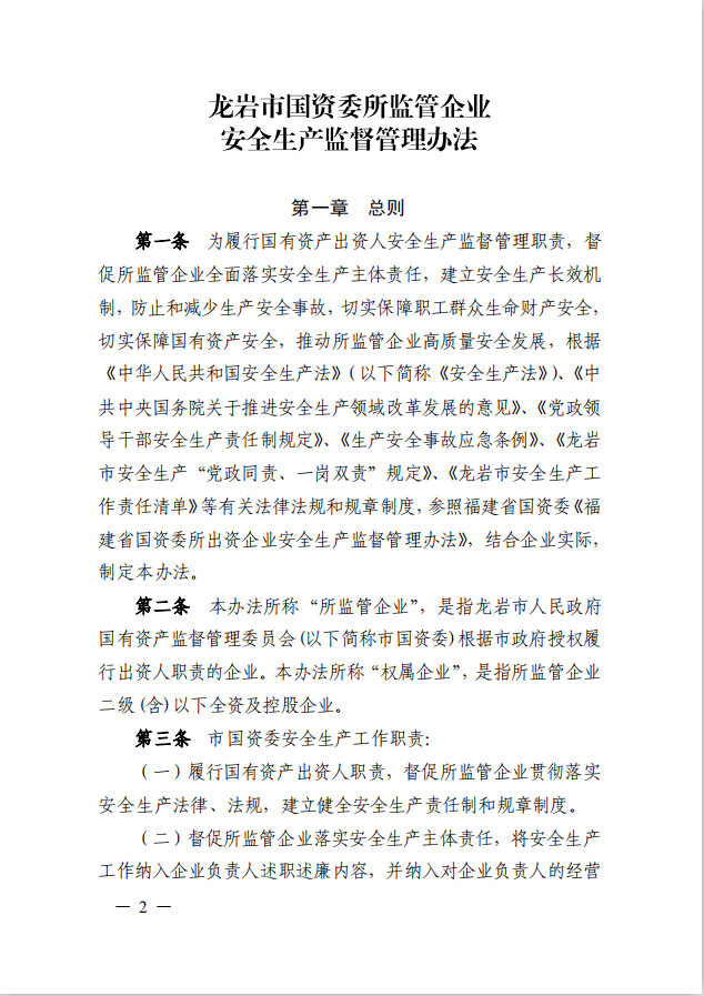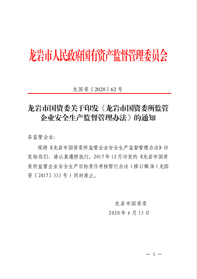 龍巖市國資委關(guān)于印發(fā)《龍巖市國資委所監(jiān)管企業(yè)安全生產(chǎn)監(jiān)督管理辦法》的通知(龍國資[2020]62號(hào))