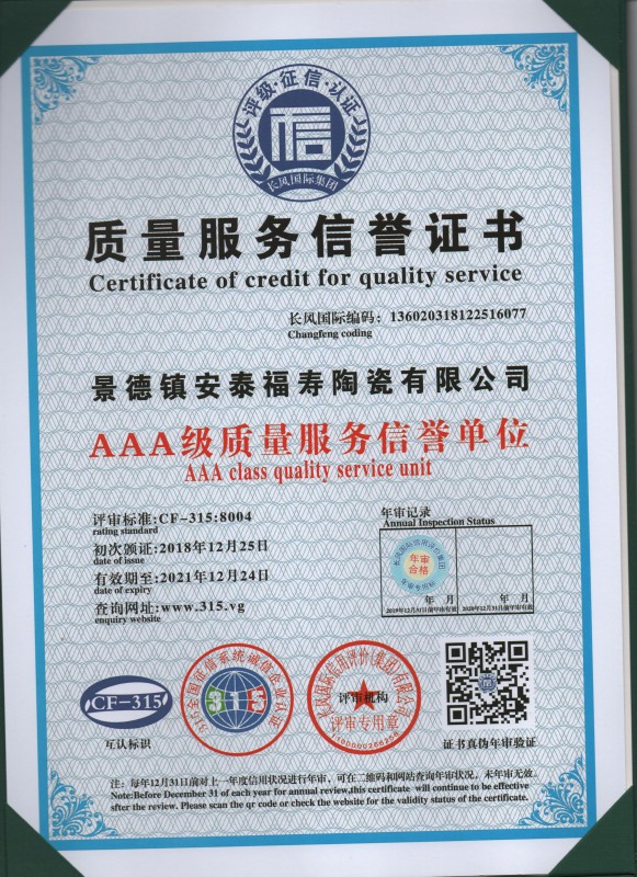 質(zhì)量服務(wù)證書(shū)
